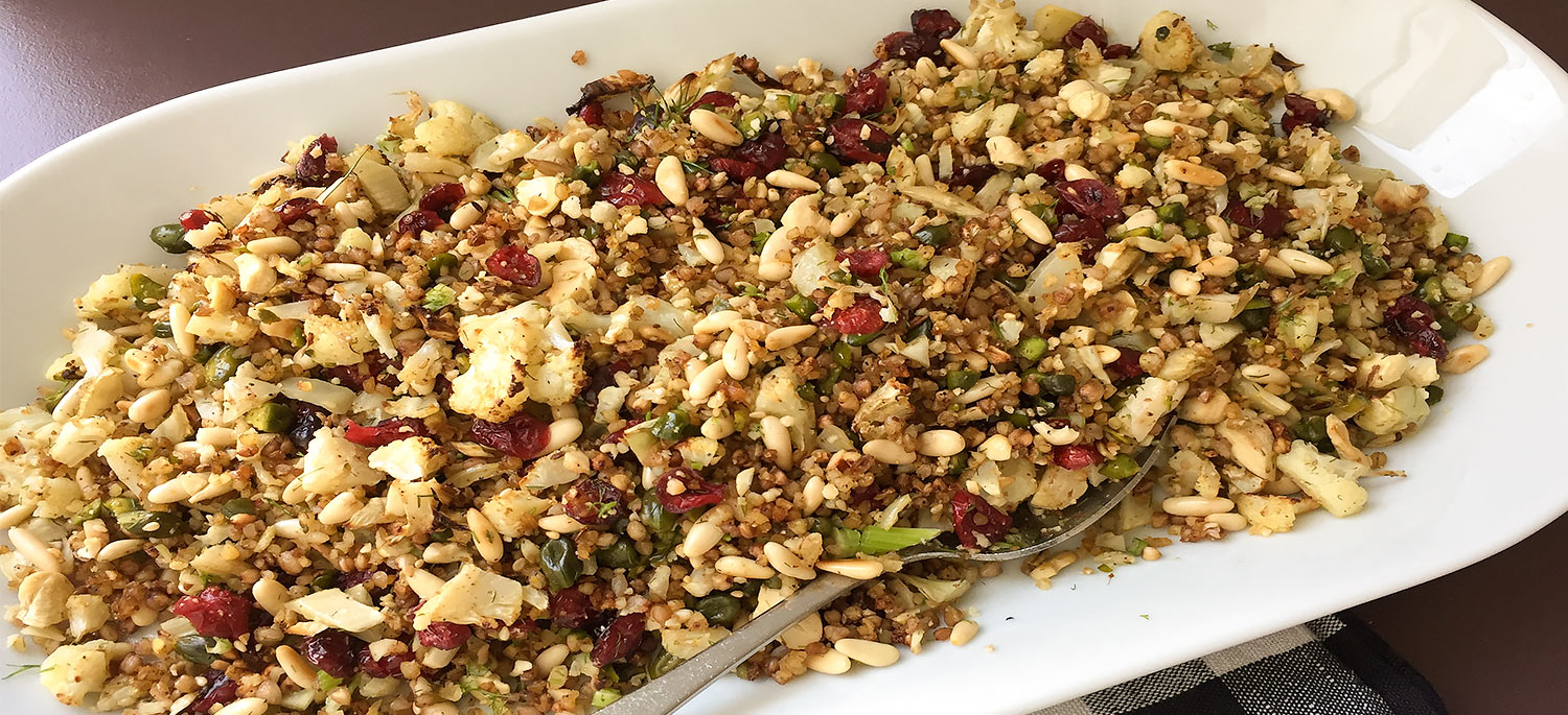 • Blumenkohl mit Buchweizen, Bulger, Olivenöl und den Gewürzen mischen.
