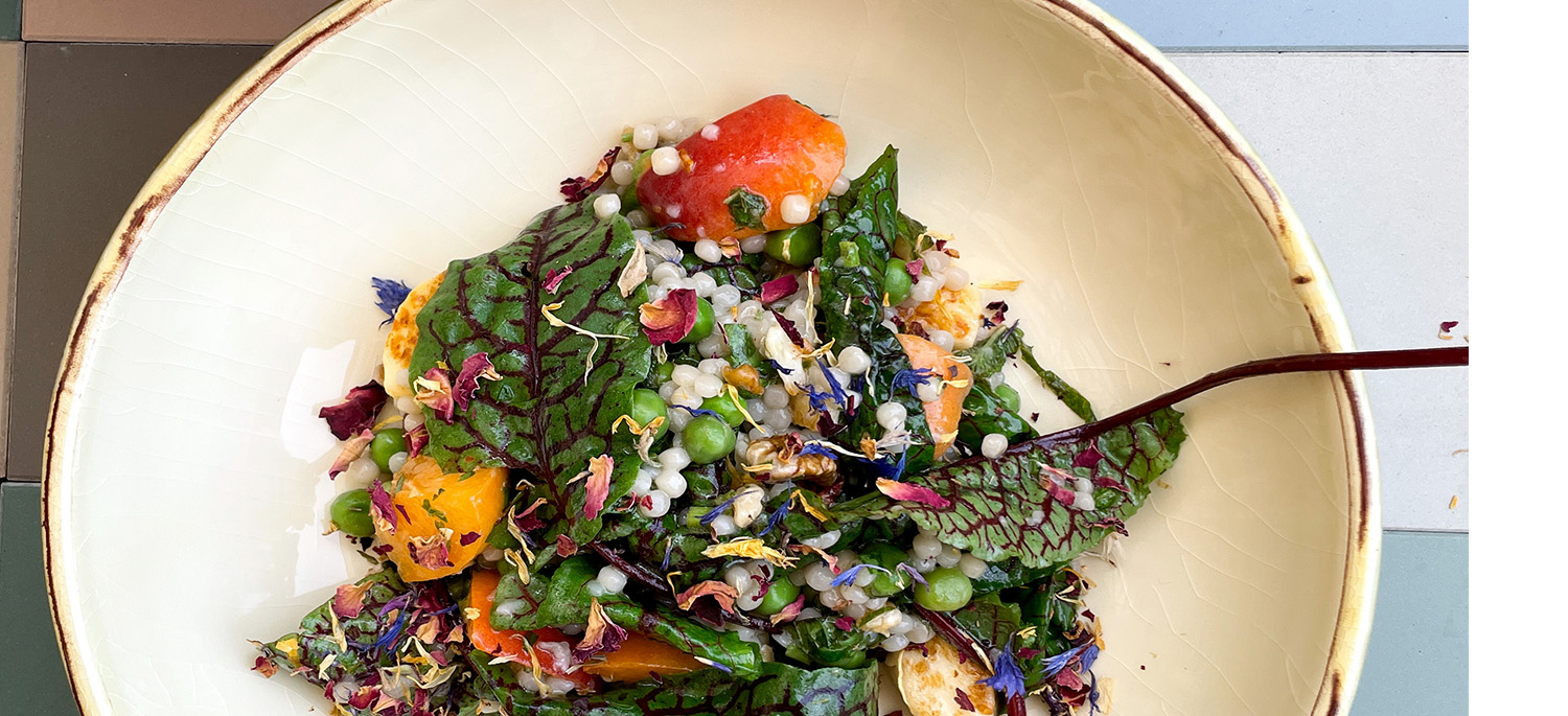- Alle Zutaten mischen und mit den Blüten garnieren.