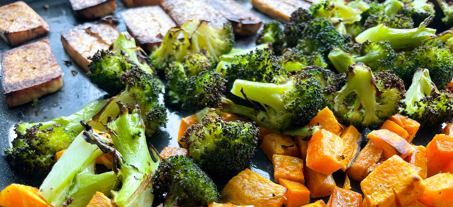 - Den Tofu auf ein mit Backpapier ausgelegtes Backblech legen und mit der Essig-Sojamischung bepinseln. Auf die andere Hälfte des Backblechs die Süsskartoffeln und Brokkoliröschen geben und mit etwas Öl, Salz und Pfeffer würzen und alles zusammen 20-20 Min. im Ofen auf ca. 180-200 Grad backen.